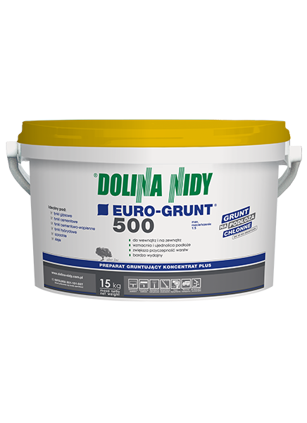 Gebruik de EURO-GRUNT 300 primer door het eerst te verdunnen met water (1:5) endaarna aan te brengen op absorberende – en poreuze ondergronden zoalscellenbeton, bakstenen en gipsplaten. Het product werkt ideaal tijdens hetvoorbereiden van oppervlakken, voordat je gips-, cement- of egalisatielagenaanbrengt. Dankzij het hoge doordringingsvermogen zorgt deze primer voor een sterke – en uniforme ondergrond, waardoor je werk perfect hecht en gemakkelijk droogt. Wacht na het aanbrengen 4-12 uur voordat je verdergaat met de volgende laag. De EURO-GRUNT 500 primer is dus veelzijdig en gemakkelijk te gebruiken.