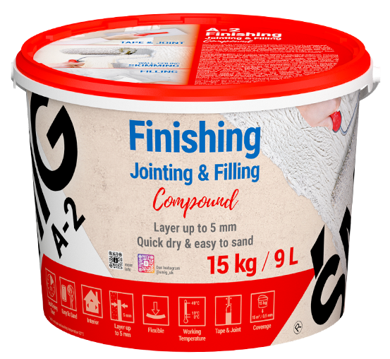 Het SMIG A-2 van SMIG UK is een veelzijdig kant-en-klaar voeg-, vul- en afwerkingsmiddel in witte pasta-vorm. Het product is speciaal ontwikkeld voor interne toepassingen zoals het glad afwerken van muren, plafonds en gipsplaten. Dankzij de gebruiksklare samenstelling kun je A-2 direct uit de emmer verwerken zonder vooraf te mengen.